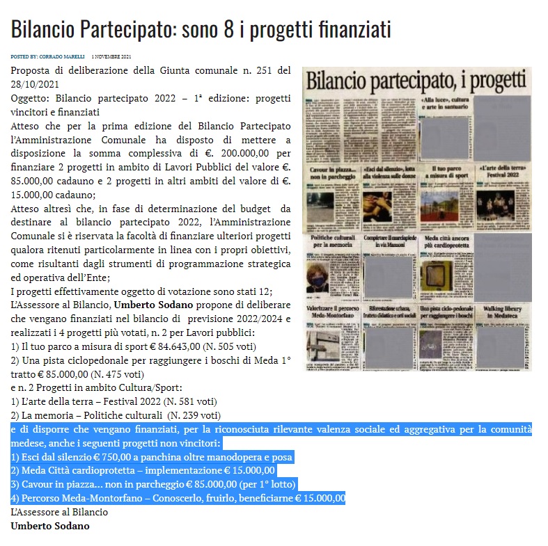 Il progetto “ESCI DAL SILENZIO” ripescato dalla giunta per il bilancio partecipativo del 2021 ad oggi non è presente per chi volesse consultare lo stato dei lavori nella sezione “STATO D’ATTUAZIONE DEI PROGETTI VINCITORI E FINANZIATI” Qui il link: Comune di Meda : Impegno dell’amministrazione comunale a terminare i lavori ammessi a finanziamento entro aprile 2022