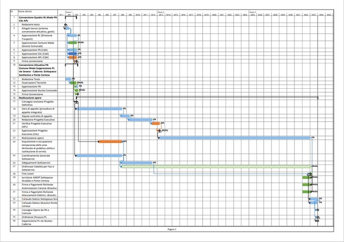 Esiste un cronoprogramma dei lavori aggiornato per la realizzazione del Raddoppio dei binari sulla tratta FNM tra Seveso e Meda. Qualora non esistesse un cronoprogramma aggiornato E’ possibile indicare una fascia temporale per vedere completata l’opera? - Rispetto all’iter di progettazione. A quale fase siamo nell’ideazione dell’opera Sottopassaggio di Via Seveso e Cadorna?