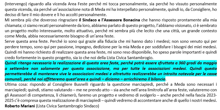 Analizzando l’intervento del consigliere Mariani è interessante ricavarne il prospetto economico che viene fatto dell’opera in cui finalmente il Comune di Meda, quindi ogni singolo cittadino, può avere un ritorno economico dagli eventi. Valutiamo che la realizzazione dell’area non sia spinta dal 4 e 48 che spesso ha caratterizzato il modo di procedere di Santambrogio: lavori senza qualità ma funzionali al like ed il consenso personale. Esempio: Parco Beretta Molla consegnato con il ponte non a norma.
