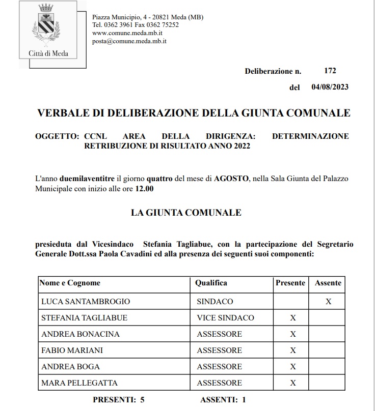 La giunta, presieduta dal Vicesindaco Dott. Stefania Tagliabue (Fratelli D’Italia) alla presenza di tutti gli Assessori è avvenuta lo scorso 4 agosto 2023.