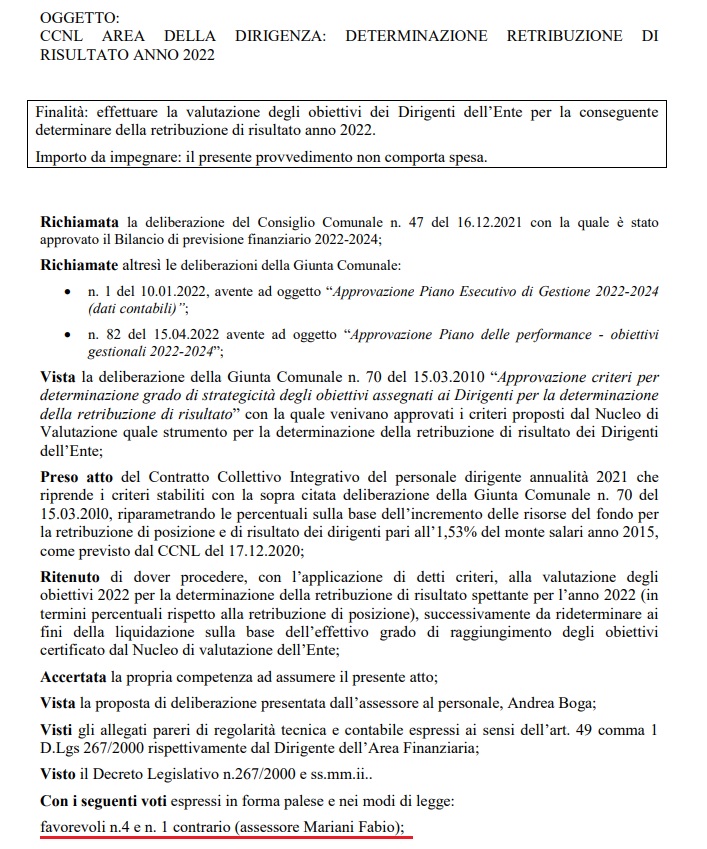 La delibera nasce al fine di effettuare la valutazione degli obiettivi delle figure dirigenziali operanti nel Comune per determinare la conseguente retribuzione di risultato (premi) legate all’anno 2022.