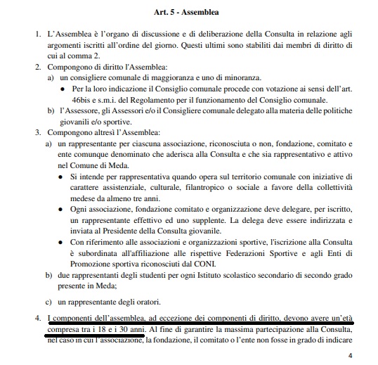 NELLA LOCANDINA DELLA COOPERATIVA SPAZIO GIOVANI SI FA RIFERIMENTO AD UN INVITO RIVOLTO A GIOVANI DAI 18 AI 25 ANNI. LA CONSULTA GIOVANILE, TRAMUTATA IN GIOVANI E SPORT AFFERMA NEL PROPRIO STATUTO CHE I COMPONENTI VANNO DAI 18 AI 30 ANNI.