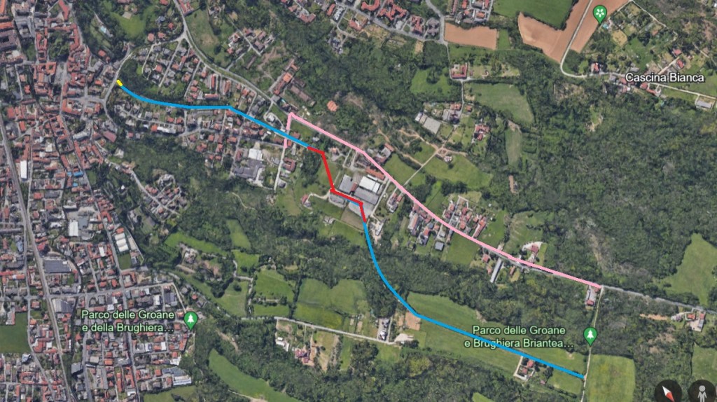 Da via monte Bianco alla Zoca dei Pirutit. Tra strade bianche, campi ed aree industriali si sviluppa già un tracciato che porta i medesi dalla città al bosco. Esso è interno alla strada corrente in Via Santa Maria, andrebbe riqualificato per permettere una sicuro accesso al polmone verde medese