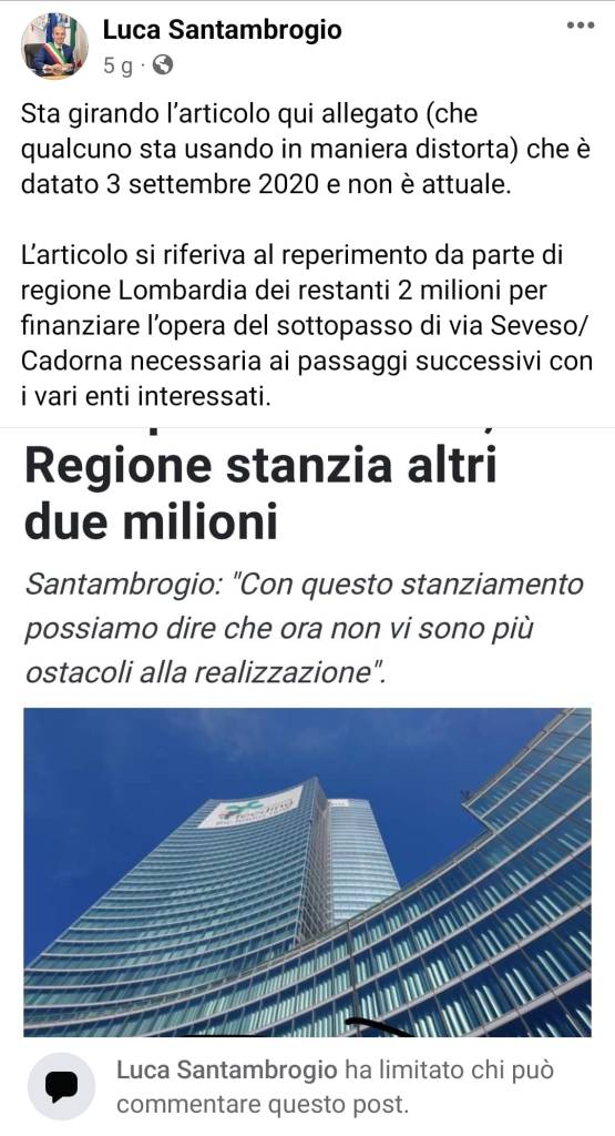 Casus belli che ha innervosito il Sindaco è stato il rilancio di un commento rilasciato nel 2020 dopo che Regione Lombardia, attraverso il Piano Fontana, aveva arricchito la somma stanziata per realizzare il sottopasso di via Seveso/Cadorna di altri 2 milioni di € (arrivando ad una cifra totale di 11 mln di €) in cui Santambrogio affermava – riassumendo – che raggiunta la totale copertura del progetto non ci sarebbero più stati ostacoli alla realizzazione dell’infrastruttura.