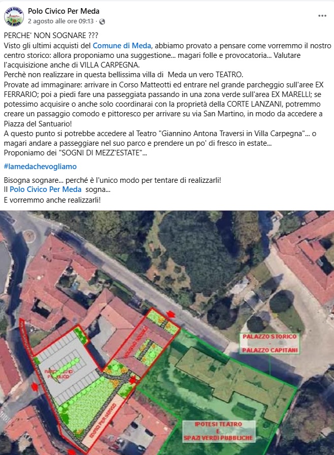 Il Polo Civico si scopre fiero alleato della maggioranza nel progetto di realizzare in futuro il Teatro in Meda, definito: “Sogno di Mezzaestate”.
